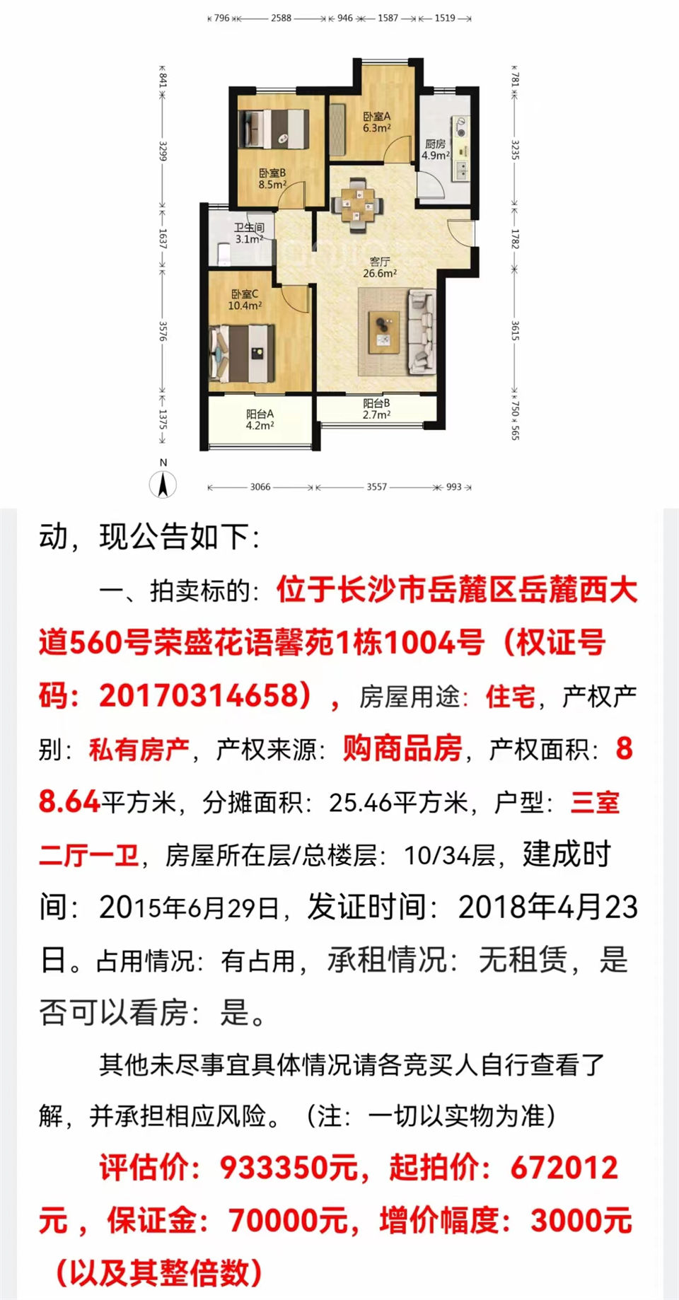 恭喜吳姐張哥撿漏榮盛花語馨苑(麓谷核心區(qū)域)法拍房一套,88平,67萬成交,撿漏十幾萬,成交單價才7500元一平。