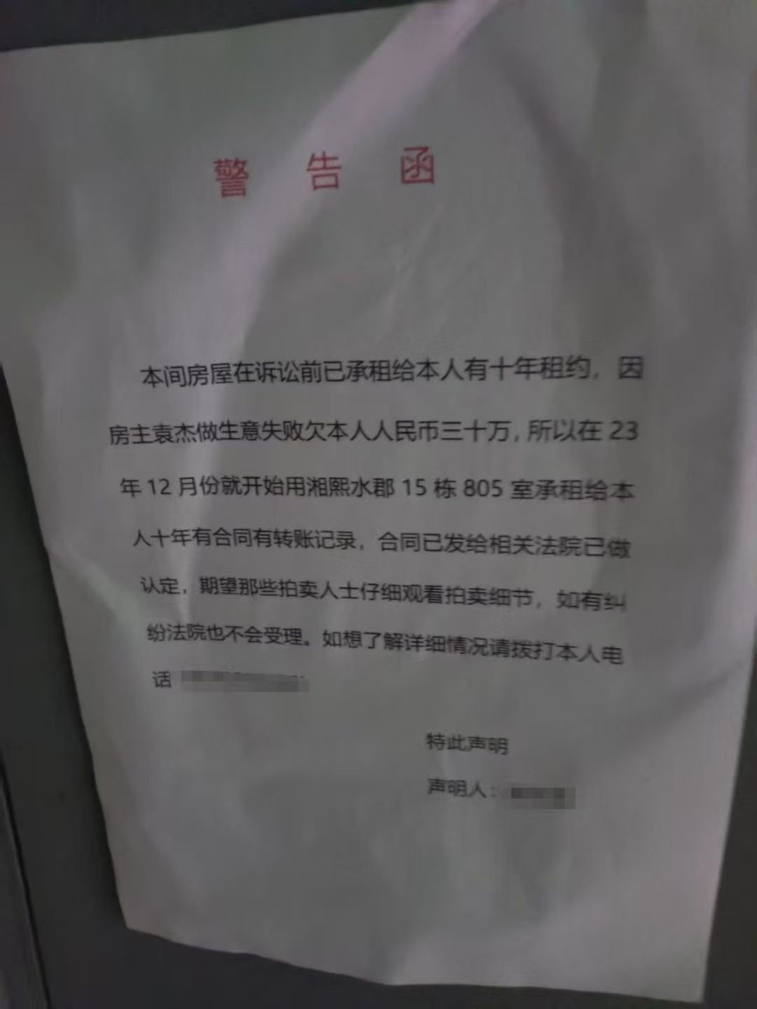 (圖2能說明)我們是長沙最專業(yè)的法拍公司(湖南法拍網(wǎng)法拍房地產(chǎn)經(jīng)紀(jì)有限公司),因?yàn)檫@房子門上直接貼了《10年長租警告函》,F(xiàn)Y也沒組織看房,所以哪怕低于市場價30萬,都沒人敢拍,全被嚇走了。
